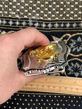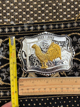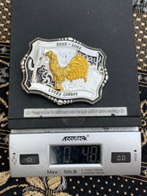 Celebrate the spirit of the rodeo with this stunning Lucky Cowboy Belt Buckle, featuring a bold gold-tone Rooster in mid-action against a finely detailed silver backdrop. The intricate engraving showcases western motifs, including desert cacti and swirling scrollwork, framed by a classic scalloped edge with beaded accents.